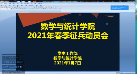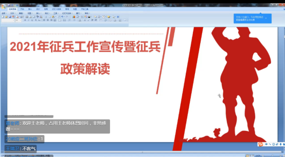 为增强员工的爱国奋斗精神,激发员工参军入伍热情,号召同学们用实际行动报效祖国,无愧于伟大的时代,2021年1月7日晚19:30,tyc122cc、学工部开展2021年春季征兵工作动员会,本次动员会通过线上进行,学工部王瑞卫、学工办主任董婷瑜、辅导员刘佩、公司230余名员工参会。