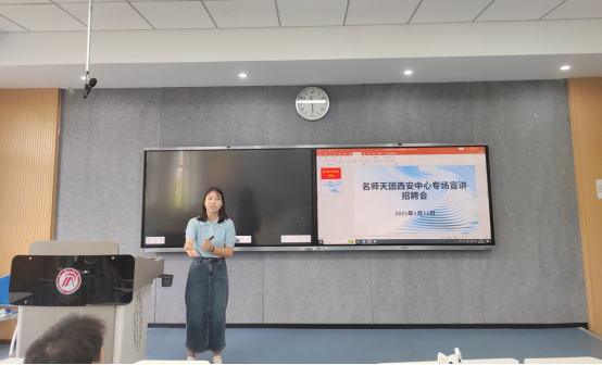 西安虹途公司是西安市第八十三中学“名校+”合作校,人事主管张帆展示了校园环境和教学设施,展示了其“双师护航”教学模式及衡水教育特色,包括主讲教师团队研发的“思维导图学习法”与助教团队推行的个性化辅导闭环管理,重点介绍了本次招聘的“启星计划”。名师天团西安中心聚焦“AI+教育”创新,通过智能教学系统实时追踪学情、虚拟互动平台提供24小时学习支持,展现了科技赋能教育的实践成果。两家招聘单位分别就毕业班员工关心的岗位需求特质、薪资待遇、晋升空间等和在场同学进行了交流。
