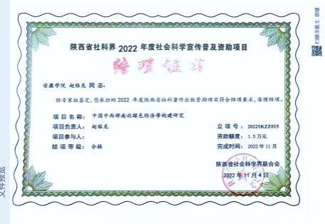 2018年在科学出版社出版的《中国中西部南北旅游大通道的构建研究》著作成果,获得2019年陕西高等公司人文社会科学研究优秀成果三等奖。