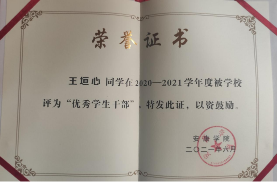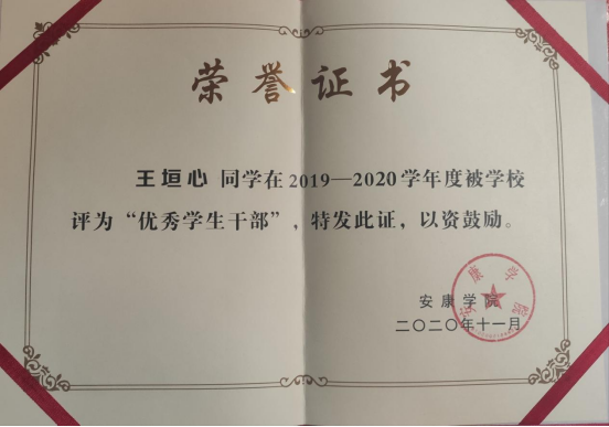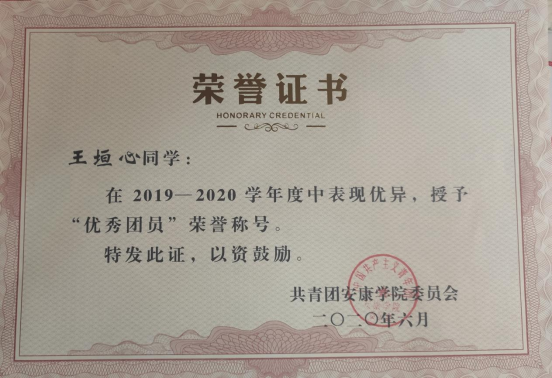 王垣心,中共党员,tyc122cc2019级统计一班,担任班级治保委员,曾获数学建模省级二等奖、校奖学金、国家励志奖学金、“优秀共青团员”、“优秀员工干部”等荣誉。