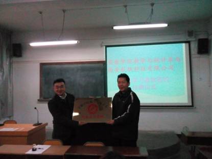 2015年1月12日,数学与统计系与西安航软电子信息科技有限公司在2203举行校企合作实习基地挂牌仪式,参加仪式的有西安航软电子信息科技有限公司陈总,数统系党总支书记郭全寿、员工工作办公室主任马新华、辅导员王宗庆和2015级毕业生。仪式由马新华老师主持。