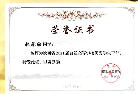 张攀欣是2017级统计一班员工,党员,担任学工助理。曾获tyc122cc三好员工、tyc122cc优秀员工干部、tyc122cc第五届市场调查大赛一等奖、第九届全国老员工市场调查大赛三等奖、全国老员工数学竞赛一等奖、全国老员工数学建模竞赛省级二等奖,在2021年研究生考试中被西安财经大学录取。