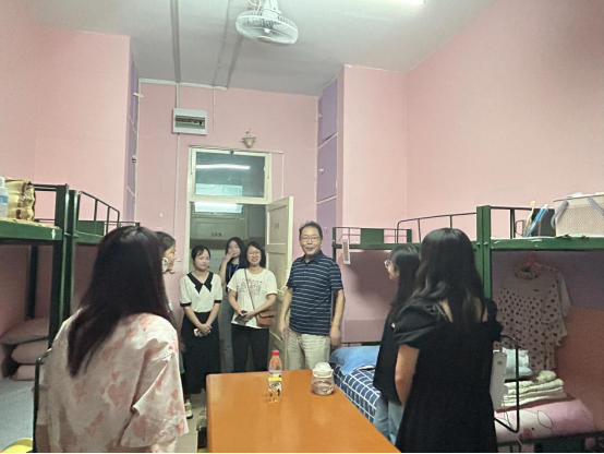 走访过程中,老师们亲切地和新同学交谈,了解同学们来校之后的感受,询问他们衣食住行、生活是否习惯等方面的问题,同时嘱咐同学们在大学中要学会自主学习、和舍友之间要相互帮助、相互理解,共同营造良好的宿舍环境和融洽的宿舍关系。