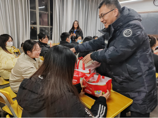 到场老师为考研学子分发了精心准备的考研暖心礼包,包括御寒手套、牛奶等。
