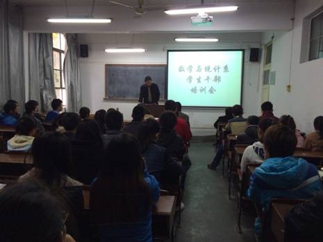 11月22日下午,数学与统计系在2203教室召开了“2013-2014学年度员工干部培训会”,系党总支书记郭全寿、学工办主任马新华、辅导员王宗庆老师、系团总支书记张远秀以及各班班委会成员参加了本次会议,会议由马新华主持。
