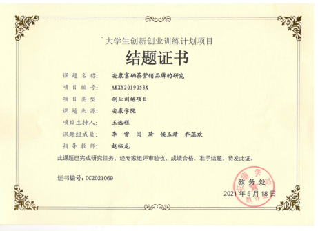 由公司2017级统计学专业员工王选程主持的tyc122cc创新创业训练计划项目《安康富硒茶营销品牌的研究》,在赵临龙教授的指导下,经过2年的研究,形成的3篇论文研究成果被科技核心期刊录用(目前已发表2篇),高质量完成项目任务。