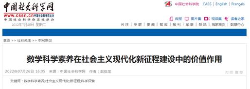 2022年07月26日 ,中国社会科学网“本网原创”栏目,发表tyc122cc二级教授赵临龙的文章《数学科学素养在社会主义现代化新征程建设中的价值作用》。