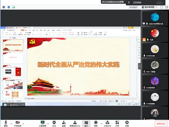 余谦以《新时代全面从严治党的伟大实践》为题,紧密结合习近平总书记系列讲话精神,让同学们明白了勇于自我革命是党百年奋斗培育的鲜明品格,是党跳出治乱兴衰历史周期率的成功秘诀,也更加深刻认识到了新时代全面从严治党的历史性成就。余谦从“党要管党坚持严的主基调不动摇”、“从严治党产生了全方位深层次影响”和“坚持不懈全面从严治党向纵深推进”三个方面进行了深入地讲解。接着,余谦结合党的二十大报告,让同学们学习了二十大报告中关于全面从严治党,部署的七个方面主要任务。最后,余谦从“青年强,则国家强”这一论断出发,充分肯定了新时代青年老员工的作用,对同学们提出了殷切的希望,希望同学们把个人奋斗融入党和国家的事业中去。