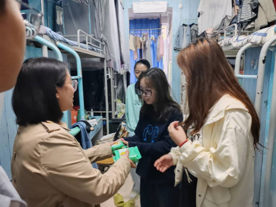 本次检查重点针对宿舍卫生、大功率用电器及寝室通风等情况进行了细致的排查。检查过程中,辅导员董婷瑜、刘佩、马勇关心了员工近期的学习生活状况,询问了同学们的假期安排,提醒员工在出行出游时,注意交通安全,避免意外事件发生。经检查,宿舍整体状况良好,较多数宿舍整体干净整洁、床铺上物品及其他生活用品摆放整齐,并且无大功率用违章电器,宿舍安全管理制度较为完善。辅导员针对检查过程中出现的问题,如电插板摆放位置、部分宿舍卫生情况等进行了提醒,并叮嘱同学们务必时刻注意电安全,杜绝安全隐患。检查结束后,辅导员给每位同学分发了月饼,并送上了节日祝福。