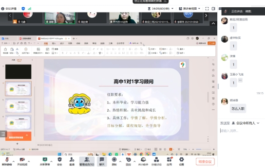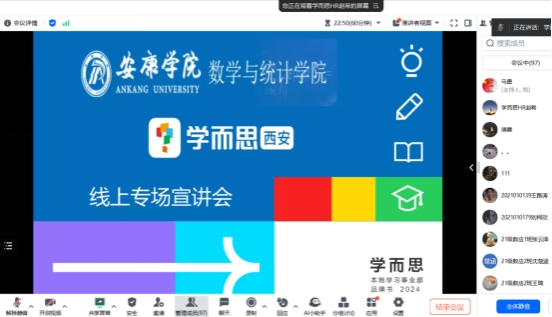 为拓宽毕业生的就业视野,促进校企合作交流,10月29日,tyc122cc召开了学而思线上招聘宣讲会,2025届毕业生约180余人参加,会议由毕业班辅导员马勇主持。