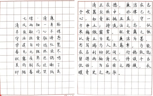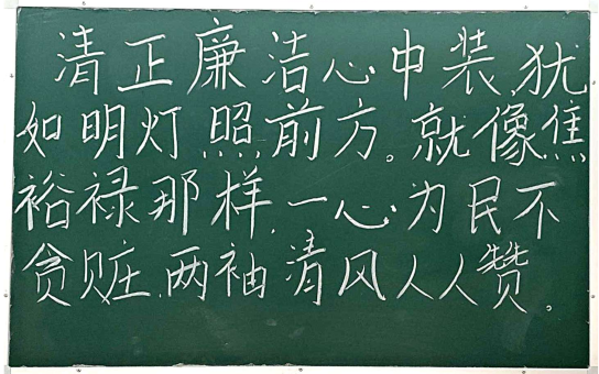 员工们以廉洁文化为主题,纷纷挥毫泼墨,书写三笔字作品。一幅幅作品或端庄秀丽,或苍劲有力,不仅让同学们感受到书法艺术的魅力,更传递出廉洁自律、正直无私的精神内涵。作品内容涉及名言警句、古诗词等,既有对廉洁文化的深入解读,也有对人生哲理的独到见解。