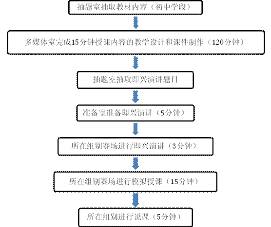 初赛由教学设计(含课件制作)、即席演讲、说课、模拟授课四个环节构成。比赛设计学段为初中,内容以“课标”为准,不指定教材。比赛总分100分,其中即席演讲满分30分,模拟授课满分45分,说课满分25分。